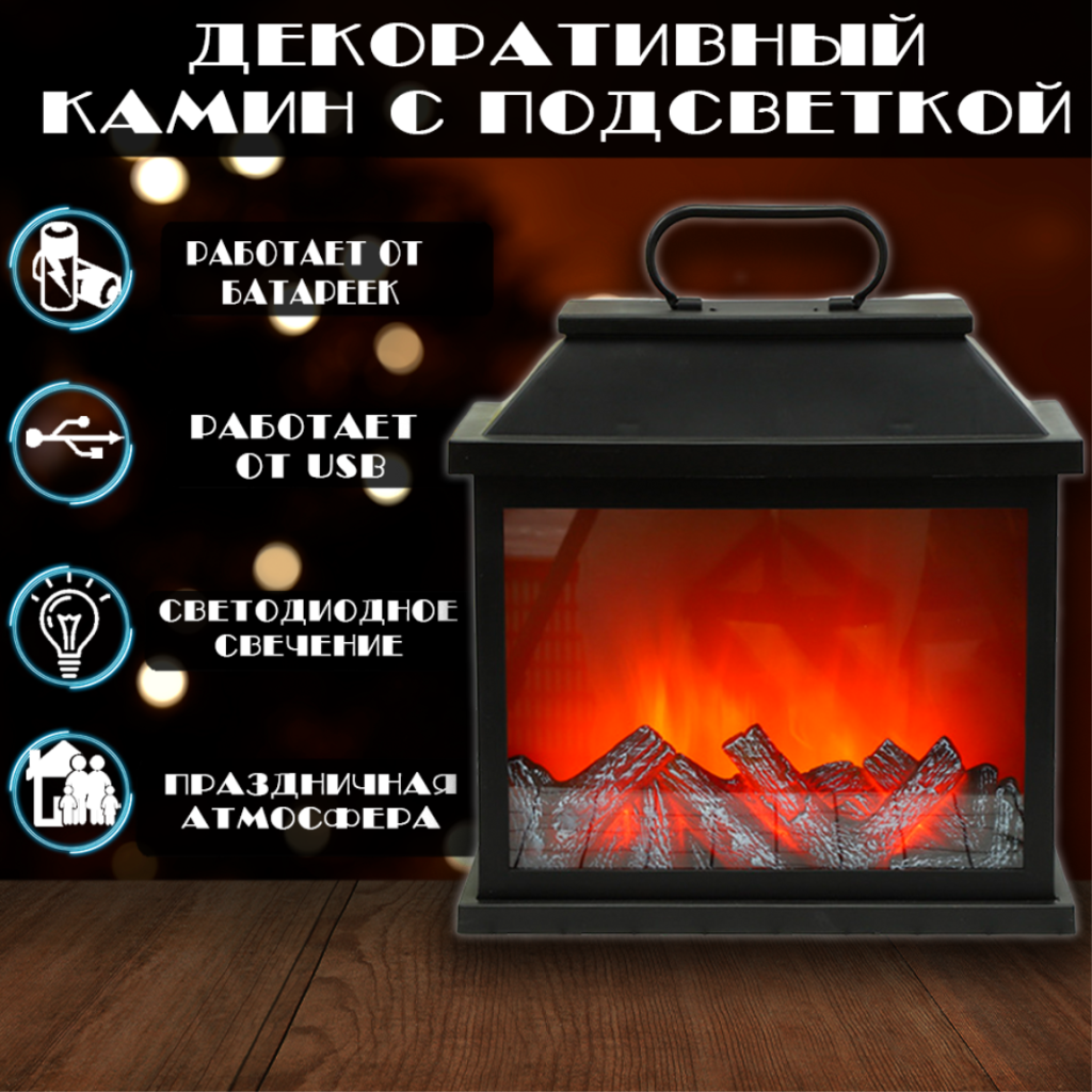 Светодиодный камин с имитацией горящих дров и эффектом живого огня, незаменимый помощник в создании неповторимой атмосферы уюта и тепла. Несомненное преимущество в отличие от живого огня светодиодный камин не выделяет копоти и дыма, а также не выбрасывает искр и не несет опасности возгорания. Встроенные светодиоды имеют бесспорное преимущество перед ламповыми, поскольку ресурс светодиодов составляет 100 000ч. Автономное питание позволяет разместить камин в любом удобном для Вас месте. Устройство используется как постоянный элемент интерьера, в качестве безопасного новогоднего и рождественского декора, в качестве ночника. Оригинальное интерьерное решение и приятный подарок для Ваших близких.