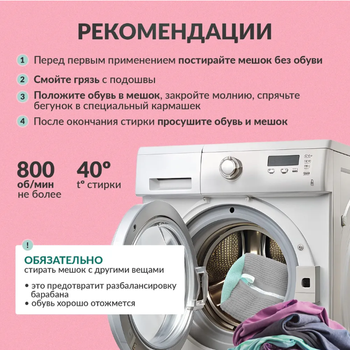 Вы сможете легко стирать не только кроссовки, но и бельё в одном мешке, что сэкономит ваше время и упростит процесс стирки.