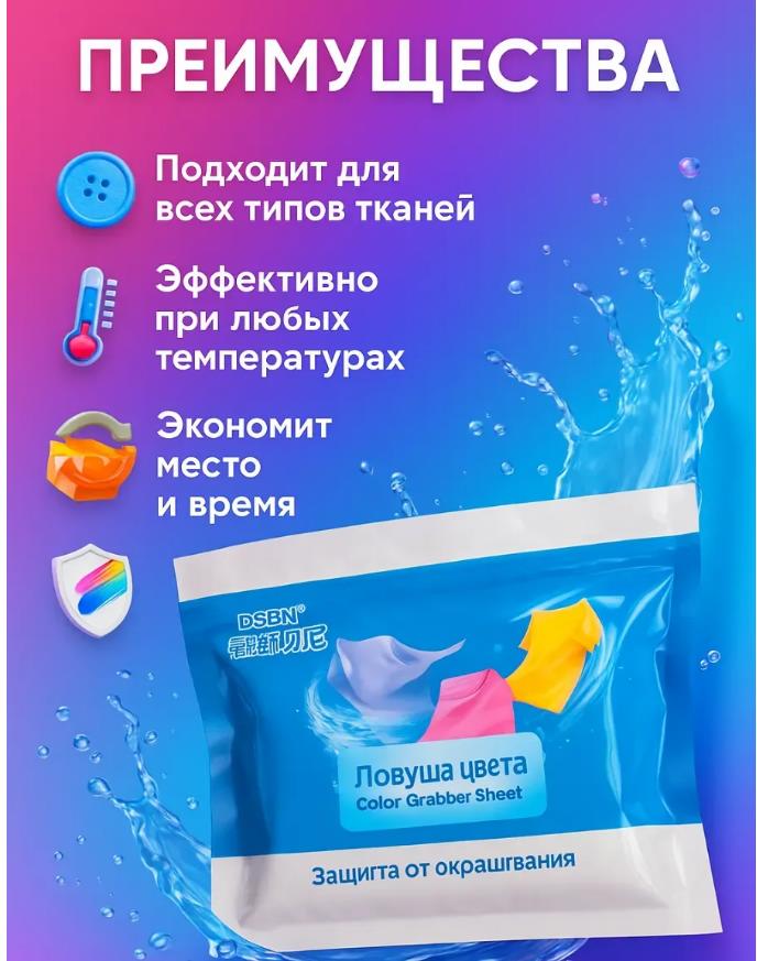 Используя ловушку цвета для белья, вы можете безопасно стирать белые и тёмные вещи вместе. Это отличное решение для экономии времени и воды.
