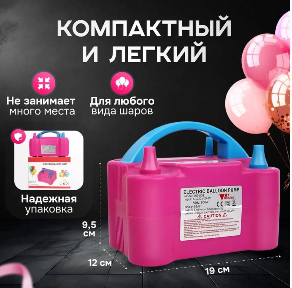Электрический насос для шариков предназначен для надувания большого количества воздушных шаров. В комплекте идут две встроенные насадки для стандартных латексных шаров и две сменные насадки для шаров меньшего размера. Компрессор мощностью 600 Вт позволит накачать 100 шаров за 10 минут. У насоса два режима надува шариков. Первый - постоянный поток воздуха. Второй - контролируемый поток воздуха. Насос может надувать одновременно 2 шарика. С помощью электронасоса можно быстро и легко подготовить фотозону для праздника и украсить День Рождения. Насос работает от любой розетки 220 В. Компрессор подходит для латексных и фольгированных шаров. Электрический насос - это незаменимая вещь для организации торжественных мероприятий