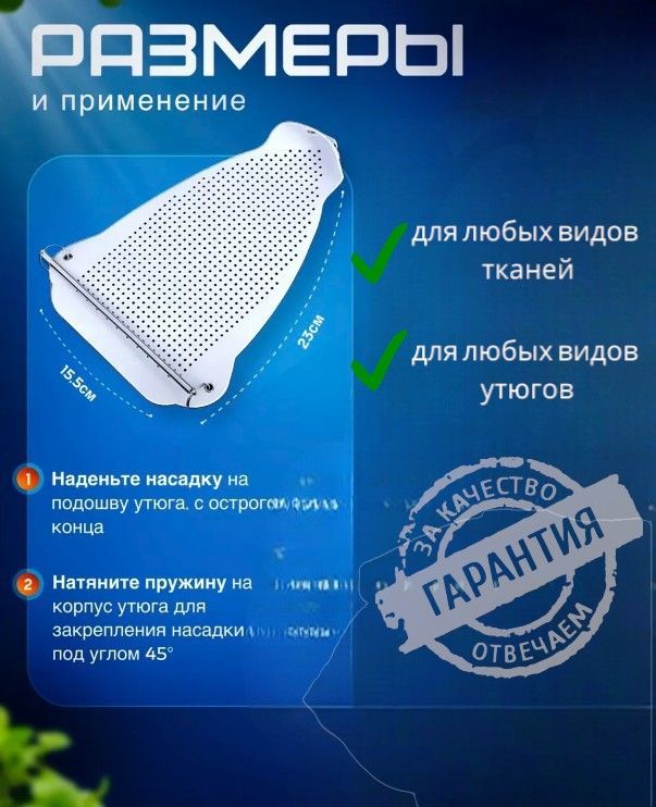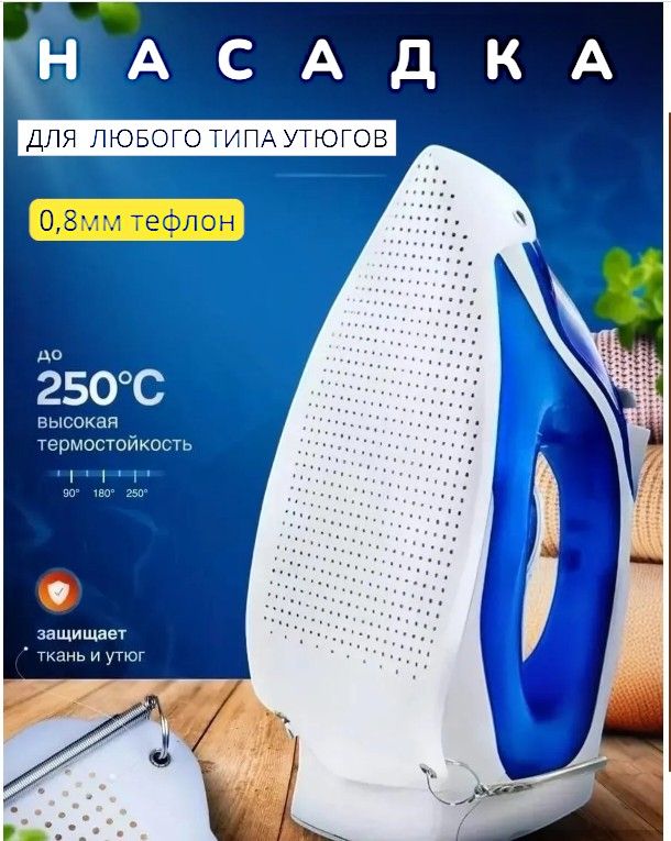 Накладка на утюг термостойкая идеальный вариант для защиты утюга и одежды при глажении. За всеми бытовыми прибором необходимо ухаживать, в том числе и за утюгом. Чтобы домашний помощник прослужил дольше, гладил так же хорошо, как после покупки можно использовать дополнительную насадку, которая крепится на основание. Наша насадка универсальная, выполнена из антипригарного тефлона, имеет размер 23х15,5 см, толщину 0,8 мм, подойдет для всех видов утюгов стандартных размеров. Накладка на подошву защитит одежду и гладильную доску от образования пятен. Тефлоновую подошву гораздо удобнее, использовать чем марлю. С помощью накладки на мелкую бытовую технику можно гладить вещи с нанесением рисунков, аппликаций, пайеток, не боясь за сохранность вещей, и не оставляя на подошве утюга загрязнений и царапин. Плотный чехол на подошву утюга исключит образование блеска на вещах, позволит прогладить деликатные ткани, такие как шелк, шерсть, не расплавит синтетические материалы. На аксессуаре для утюга есть специальные отверстия, чтобы пар, используемый на утюге с отпаривателем, беспрепятственно проходил сквозь насадку. Гаджет поможет забыть о регулярной чистке подошвы от прилипшей грязи и нагара. Установка насадки проста, сначала вставьте носик утюга, а потом натяните пружину на заднюю часть. Чтобы не обжечься, надевайте накладку на холодный утюг. Наша насадка подходит для всех брендов на утюг Braun, Rowenta, Philips, Polaris, Redmond, Tefal, Starwind, Bosch и другие.